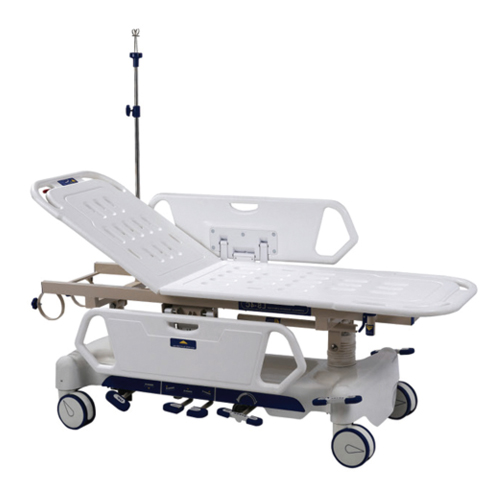 4、担架面护拦采用回转式弹性锁紧装置,翻上护拦,保障病人安全,必要时使用保险带保险 ; 翻下护栏,病人上下方便。